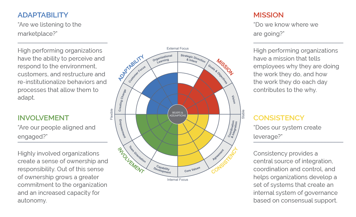 The description given to Involvement says “Are our people aligned and engaged?” Know where you’re headed and engage the people in getting there. Strength in these two quadrants will lead to profitability. Notice that profitability requires elements of each of the “four” halves of the chart. Mission is in the upper right quadrant. Involvement resides in the lower left quadrant. Top/Bottom, Left/Right. Profitability requires a bit of it all.